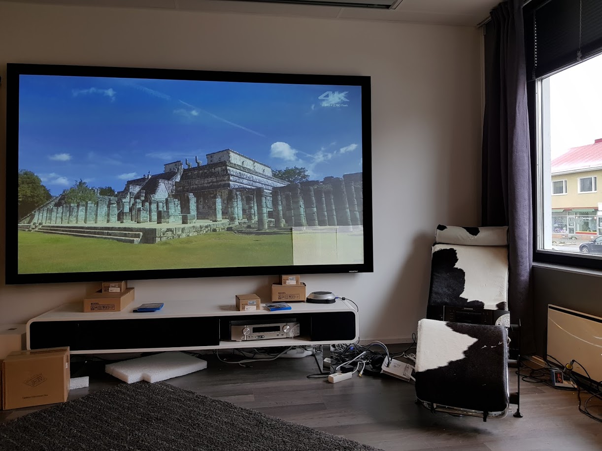 Jälleen jos vastaavaan kontrastilukuun yritetään päästä perinteisellä valkokankaalla niin tehtävä olisi mahdoton tässä tapauksessa. Sillä sivuvaloa on aivan liikaa perinteiselle valkokankaalle ylläpitämään haluttua kontrastia. Mutta keskimääräisesti 15:1 kontrasti tavallisella kankaalla tuossa tapauksessa edellyttäisi 15 000alm nettolukemaa mikä tarkoittaisi minimissään 25 000€ hintalappua kokonaisuudelle. Joten jälleen hintaero on aivan valtava ja lopputulos sopivalla tekniikalla puhuu puolestaan.